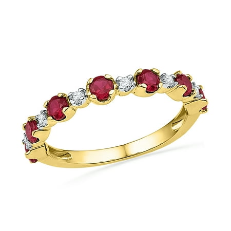 <p><span style="font-size:16px;"><b><u>Description</u></b><br /></span></p> <p><span style="font-size: 14px;">10kt Yellow Gold Womens Round Lab-Created Ruby Band Ring 1-1/10 Cttw</span></p> <br /> <p><span style="font-size:16px"><u><b>Gemstone Details</b></u></span></p> <p><span style="font-size:14px">1 & 1/10 Carats total weight<br /><br /><br /><br /></span></p> <ul type="square"> <b>Round Lab Ruby</b> <br /> <li>1.00 ct.t.w.</li> <li>Flawless clarity</li> <li>Red color</li> <li>Pave setting</li> </ul> <br /> <ul> <b>Round Diamond</b> <br /> <li>1/10 ct.t.w.</li> <li>I2-I3 clarity</li> <li>J-K color</li> <li>Pave setting</li> </ul> <br /> <p><span style="font-size:16px"><u><b>Specifications</b></u><br /></span></p> <p><span style="font-size:14px">10kt Yellow Gold<br />1.93 grams (approximately)<br />Ring size selectable</span></p> <p><span style="font-size:11px">Combined gemstone weight of 1 & 1/10 carats total weight represents a range of 1.09 - 1.11 cts. t.w.</span></p>