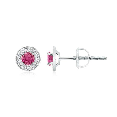 <ul> <li>Pink Sapphire Margarita Stud Earrings with Diamond Halo in 14K White Gold (4mm Pink Sapphire)</li> <li>Approximate Carat Total Weight 0.94 ct</li> <li>Screw Back Closure</li> <li>Pink Sapphires are Heat treated for enhanced brilliance and lustre.</li> <li>Free Certificate of Authenticity and 30-Days Easy Returns.</li> <li>*Get a FREE Gemstone Pendant in Silver w/o Chain</li> </ul>
