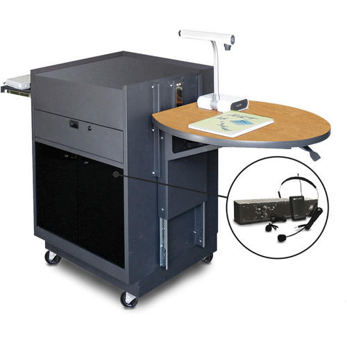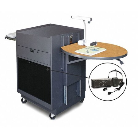 | Feature | "Construction: Unit: Steel. Platform Surface: Oak High Pressure Laminate. Doors: Acrylic. Finish: Dark Neutral Powdercoat Paint/Oak Laminate. Amplifier Module: 16 channel UHF wireless receiver. Frequency: 584 MHz - 608 MHz. Range: 300' (91 m). 50 Watt Amplifier." |