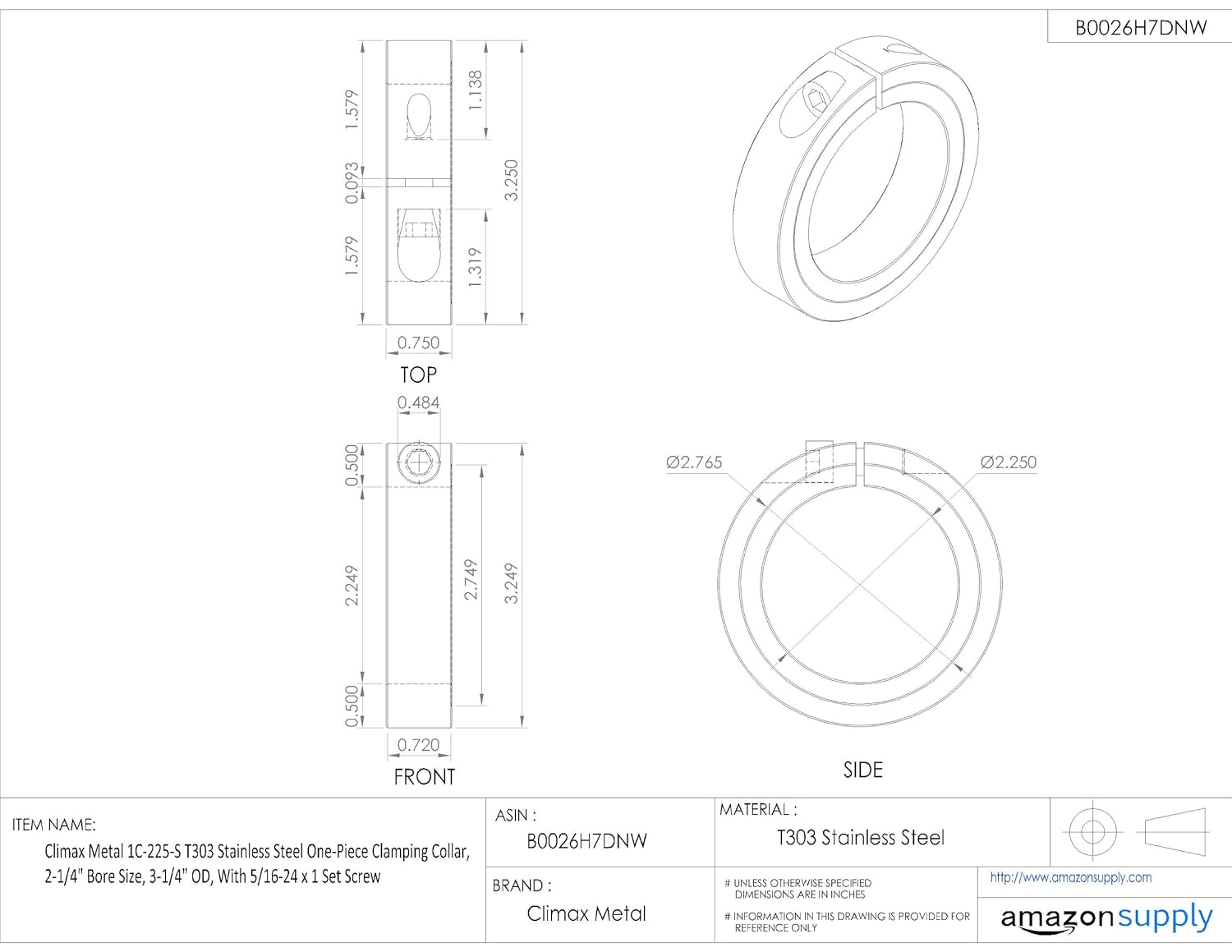Climax Metal 1C-Series One-Piece Clamping Collar, SS 1C-225-S. ✅Climax Metal authorized distributor ✅. ☎ +1 (838) 222-2023 Mon-Fri 8:00 AM - 5:00 PM ET or order online 24/7