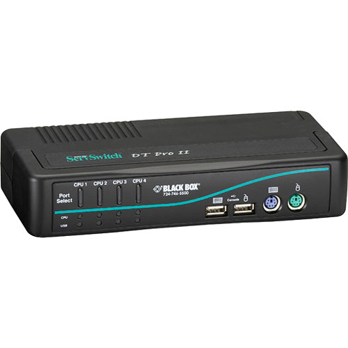 Black Box, KV7020A-K, ServSwitch DT Pro II 2-Port KVM Switching for PS/2 or USB CPUs Kit Simple, efficient, and reliable 2-port KVM switching for PS/2 or USB CPUs. Includes: ServSwitch DT Pro II, 2-Port (2) DT Pro II CPU Cables ServSwtich DT Pro II power supply User's manual Features: Use our most versatile desktop switch to control up to two PS/2 or USB CPUs and their KVM connections. Supports 1920 x 1440 maximum resolution. Choose from push button or hotkey switching. Integral LEDs on push buttons show port activity. Provides audio connections. Enables USB 2.0 peripheral switching. Autoscan function enables you to automatically scan and monitor attached computers. Works with Windows 98/Me/XP, Windows 2000, Windows NT , Linux , NetWare , and Mac OS operating systems. Control and switch multiple PS/2 or USB CPUs and their keyboard, video, mouse, and audio connections with the ServSwitch DT Pro II KVM switch. Link PS/2 KVM to PS/2 CPUs, USB KVM to PS/2 CPUs, PS/2 KVM to USB CPUs, or USB KVM to USB CPUs. Plus, you can connect audio and USB peripherals to the KVM switch. The ServSwitch DT Pro II provides superior video resolution (up to 1920 x 1440) and crystal-clear audio. Choose from two ways to switch your KVM and CPUs and USB peripherals: via front-panel buttons or PC hotkeys. Simply press the front-panel button that corresponds to the CPU you want to switch or use hotkeys to start Autoscan. The Autoscan function enables you to automatically scan and monitor all computers, one by one, that are connected to the DT Pro II. Use hotkeys to select or switch channels, bind or unbind switching, or to start or stop autoscan. You can: Select PC channel. Select hub port control. Select audio and microphone channel. Bind PC and hub port control switching. Unbind PC and hub port control switching. Bind PC and audio/microphone switching. Unbind PC and audio/microphone switching. Switch to next lower PC channel. Switch to next higher PC channel.