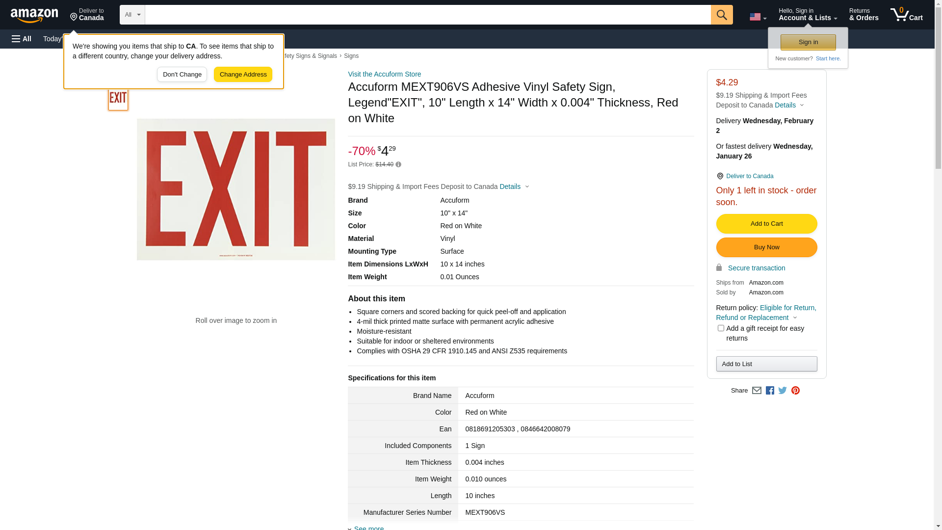 | Feature | 4PK Accuform MEXT906VS Admittance & Exit Entrance & Exit EXIT 10" x 14" Adhesive Vinyl |