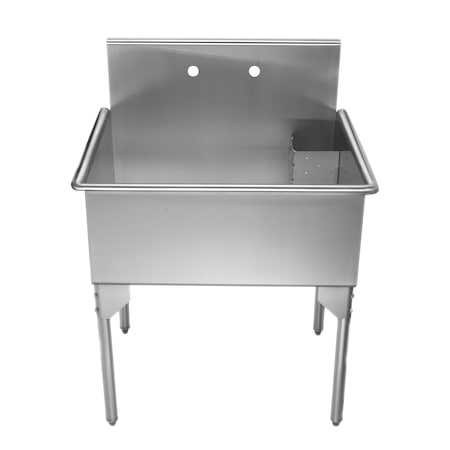 Whitehaus Pearlhaus Collection 30 Inch Brushed Stainless Steel Freestanding Utility Sink. Scratch-resistant Commercial-grade premium Stainless Finish. Easy to adjust legs with reinforced supports. Removable lint trap designed to catch unwanted debris. Diagonal grooves to channel water to drain. Seamless rounded rim and corners. 16 gauge, 304 Series Stainless Steel, 18/8 Chrome/Nickel content. Dimensions: 44 inches H x 27 inches W x 33 inches L x 24 inches D. Sink Weight: 66 lbs. 8 inch pre-drilled holes for wall mount faucet. 2 inch rear corner drain. WHLS3024-NP.