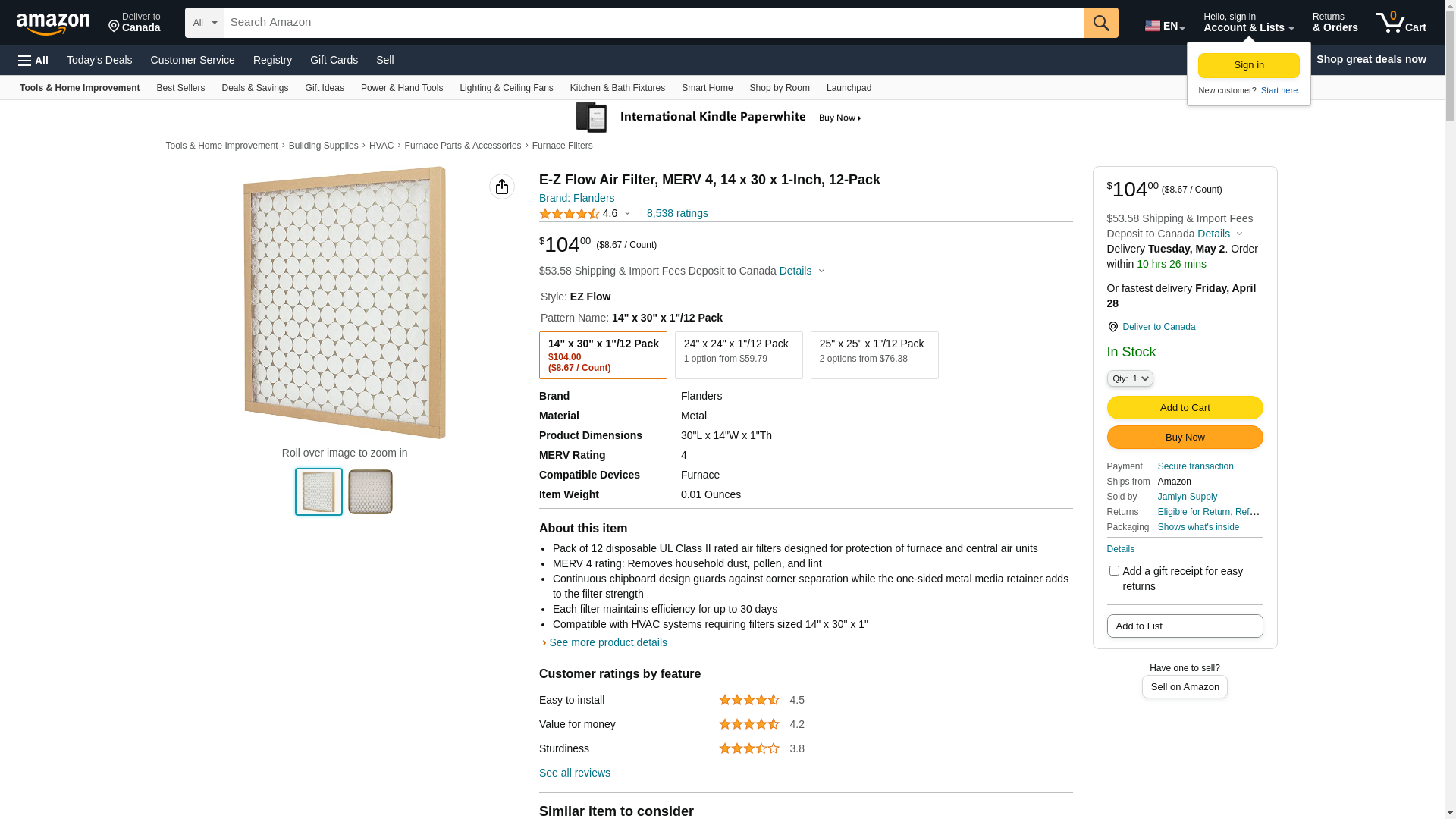 Flanders 10155.01182 E-Z Flow Air Filter, MERV 4, 18 x 20 x 1-Inch, 12-Pack
