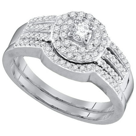 <p><span style="font-size:16px;"><b><u>Description</u></b><br /></span></p> <p><span style="font-size: 14px;">10kt White Gold Womens Round Diamond Strand Halo Bridal Wedding Engagement Ring Band Set 1/2 Cttw</span></p> <br /> <p><span style="font-size:16px"><u><b>Gemstone Details</b></u></span></p> <p><span style="font-size:14px">1/2 Carats total weight --- 1/6 carat center solitaire<br /><br />All diamonds are natural and conflict-free in origin<br /><br /></span></p> <ul type="square"> <b>Round Center Diamond</b> <br /> <li>1/6 ct.t.w.</li> <li>I1-I2 clarity</li> <li>H-I color</li> <li>4-prong setting</li> </ul> <br /> <ul> <b>Round Diamond</b> <br /> <li>1/3 ct.t.w.</li> <li>I1-I2 clarity</li> <li>H-I color</li> <li>Pave setting</li> </ul> <br /> <p><span style="font-size:16px"><u><b>Specifications</b></u><br /></span></p> <p><span style="font-size:14px">10kt White Gold<br />Widest point width: 7 mm (.28 inches )<br />Width of shank: 1.5 mm<br />3.16 grams (approximately)<br />Ring size selectable</span></p> <p><span style="font-size:11px">Combined diamond weight of 1/2 carats total weight represents a range of 0.46 - 0.58 cts. t.w.</span></p>
