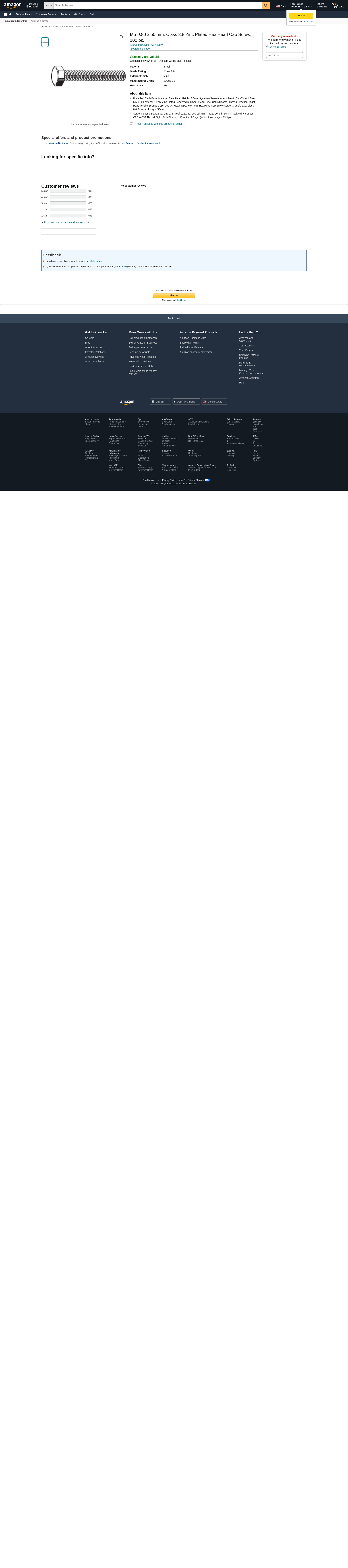 'Hex Head Cap Screw, System of Measurement Metric, Head Type Hex, Dia./Thread Size M5-0.80, Thread Type UNC (Coarse), Fastener Length 50mm, Min. Thread Length 50mm, Basic Material Steel, Screw Grade/Class Class 8.8, Fastener Finish Zinc Plated, Thread Style Fully Threaded, Thread Direction Right Hand, Head Height 3.5mm, Head Width 8mm, Proof Load 87, 000 psi, Screw Industry Standards DIN 933, Package Quantity 100'