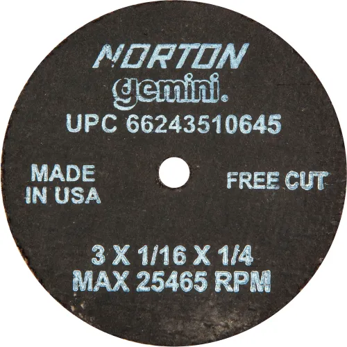 Norton Abrasives CutOff Wheel,GeminiFreeCut,3"x.062"x1-4" 66243510645 ZO-G0625527 - SIM Supply