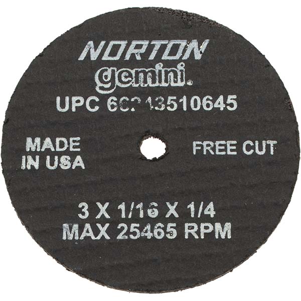 The NORTON Type 1 general-purpose cut-off wheel features aluminum oxide abrasive. For cutting and grinding ferrous metal, gray iron, and stainless.<br /><br /> Item: Abrasive Cut-Off Wheel<br /> Abrasive Wheel Type: Type 1<br /> Abrasive Wheel Diameter: 3"<br /> Thickness: 0.0625"<br /> Arbor Hole Size: 1/4"<br /> Abrasive Material: Aluminum Oxide<br /> Abrasive Grit: 36<br /> Max. RPM: 25,465<br /> Series: Gemini Free Cut<br /> Diamond Knockout: No<br /> Application: Ferrous Metal, Gray Iron, Stainless<br />