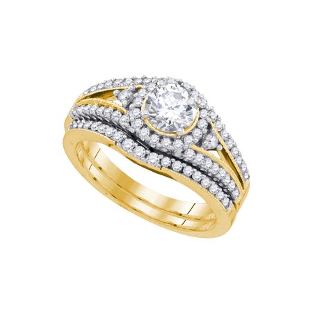 <p><span style="font-size:16px;"><b><u>Description</u></b><br /></span></p> <p><span style="font-size: 14px;">14kt Yellow Gold Womens Round Diamond Halo Bridal Wedding Engagement Ring Band Set 1-1/4 Cttw</span></p> <br /> <p><span style="font-size:16px"><u><b>Gemstone Details</b></u></span></p> <p><span style="font-size:14px">1 & 1/4 Carats total weight --- 5/8 carat center solitaire<br /><br />All diamonds are natural and conflict-free in origin<br /><br /></span></p> <ul type="square"> <b>Round Center Diamond</b> <br /> <li>5/8 ct.t.w.</li> <li>SI3 clarity</li> <li>G-H color</li> <li>4-prong setting</li> </ul> <br /> <ul> <b>Round Diamond</b> <br /> <li>5/8 ct.t.w.</li> <li>I1-I2 clarity</li> <li>H-I color</li> <li>Pave setting</li> </ul> <br /> <p><span style="font-size:16px"><u><b>Specifications</b></u><br /></span></p> <p><span style="font-size:14px">14kt Yellow Gold<br />5.28 grams (approximately)<br />Ring size selectable</span></p> <p><span style="font-size:11px">Combined diamond weight of 1 & 1/4 carats total weight represents a range of 1.23 - 1.29 cts. t.w.</span></p>