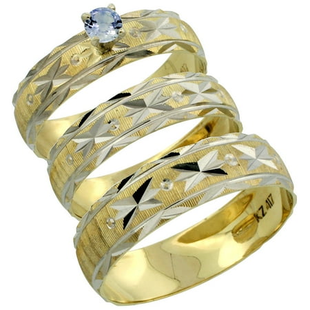 10k Gold 3-Piece Trio Light Blue Sapphire Wedding Ring Set Him & Her 0.10 ct Rhodium Accent Diamond-cut Pattern, Ladies Sizes 5 - 10 & Men's Sizes 8 - 14