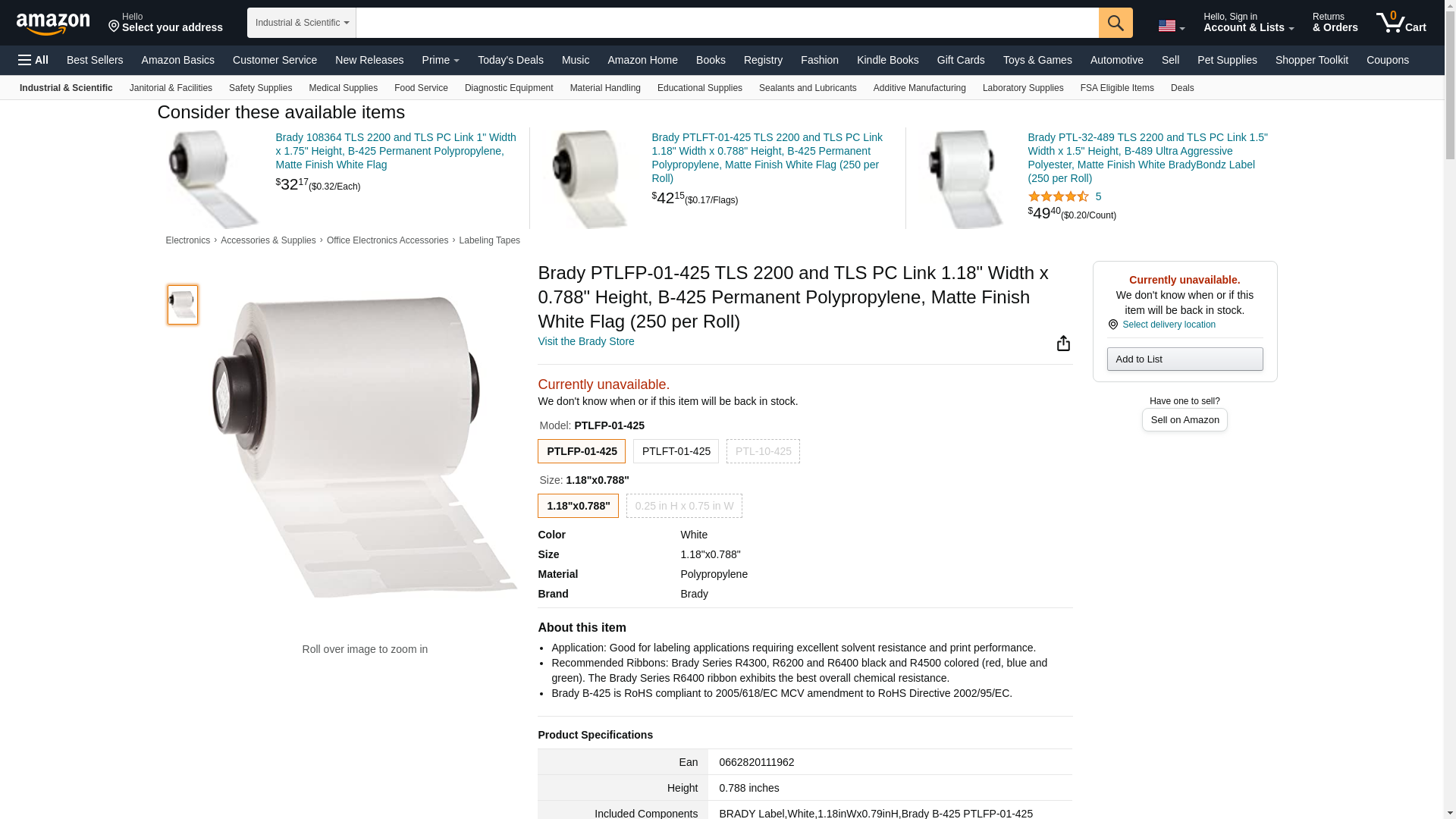 Brady PTLFP-01-425 TLS 2200 and TLS PC Link 1.18" Width x 0.788" Height, B-425 Permanent Polypropylene, Matte Finish White Flag (250 per Roll)