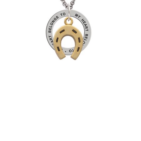 Gold Tone Horseshoe My Heart Belongs To Affirmation Ring Necklace. Gold Tone, hand enameled charms. Charm size is approx. 0.75 x 0.54 x 0.12 inches (HxWxD) including loop. Silver tone 2mm Belcher Chain Necklace is approx. 24 Inches with a Lobster Claw Clasp. Affirmation Ring is approx. 0.86 x 0.86 x 0.05 (HxWxD). This inspirational piece of jewelry is very meaningful. Its circular shape is symbolic for endless belief in the message that is imprinted around the ring. These are motivational or sentimental messages to the wearer. Perfect gift for that precious woman in your life. Tell her how much you care. PLEASE NOTE: Our products are lead safe, but are not intended for children 14 years and younger.