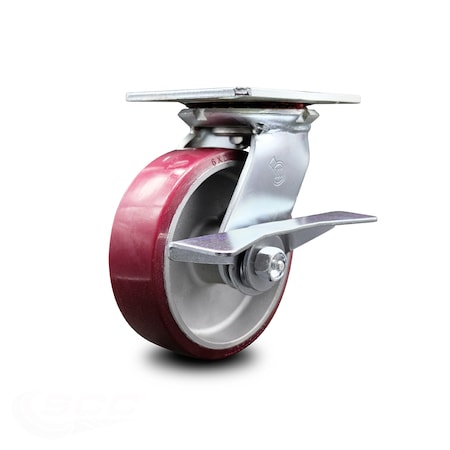 Heavy Duty Large Top Plate Polyurethane on Aluminum Swivel Caster w/6" x 2" Maroon Wheel & Side Lck Brake - 1200 lbs Capacity/Caster - Service Caster Brand