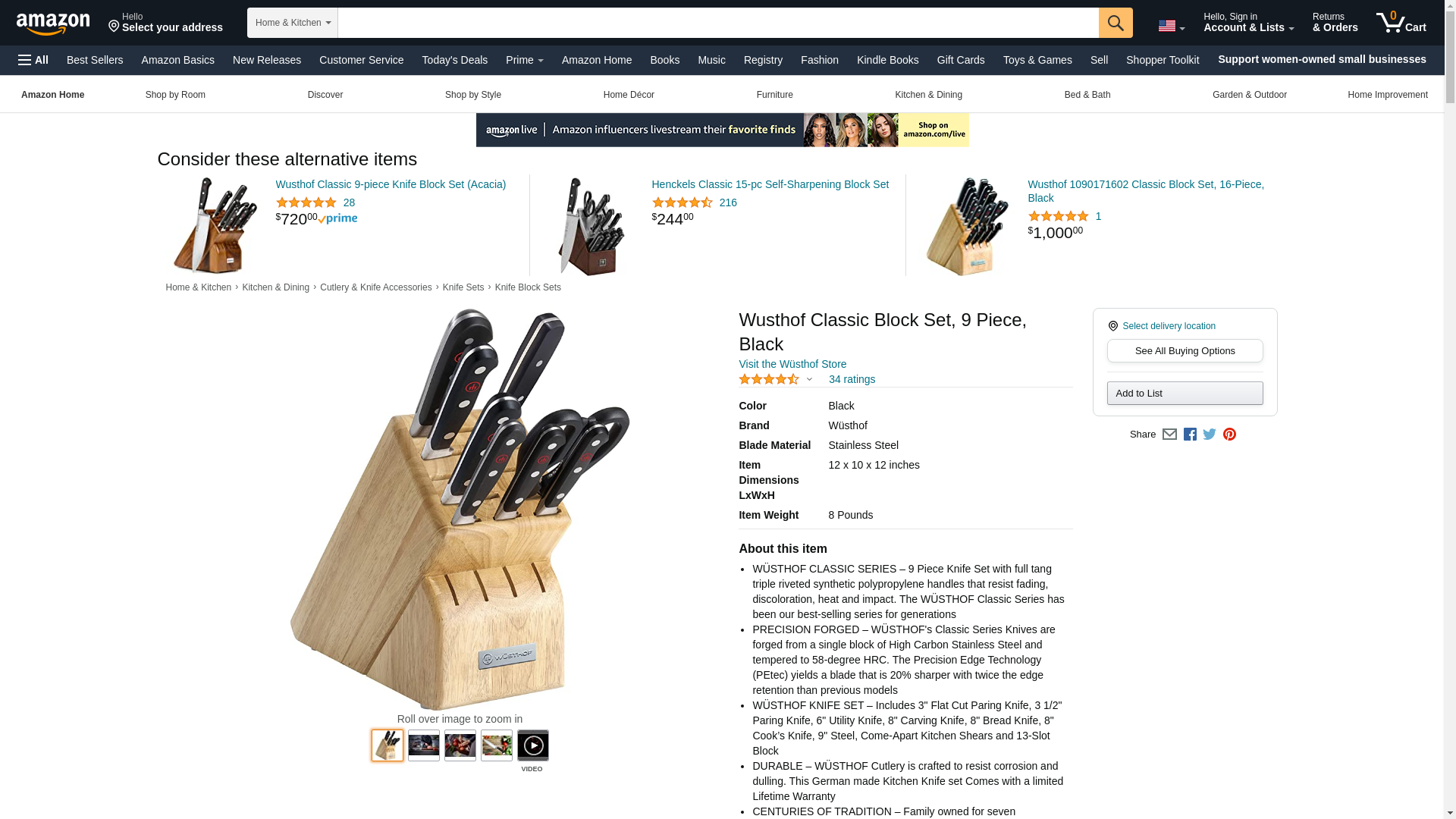 7419 Features: -Product Care: Hand wash with mild detergent, then dry and store. -Classic collection. -Pieces Included: Paring knife with 3” blade, paring knife with 3.5” blade, utility knife with 6” blade, carving knife with 8” blade, bread knife with 8” blade, cook’s knife with 8” blade, kitchen shears, sharpening steel, and block. -13 knife slots. -Ergonomic, triple-riveted handles. -Blade Material: High Carbon Stainless Steel. Handle Color: -Black. Blade Material: -High carbon stainless steel. Handle Material: -Plastic. Number of Items Included: -9. Pieces Included: -Bread knife/Carving knife/Chef's knife/Paring knife/Sharpening steel/Utility knife. Dimensions: Overall Product Weight: -9 lbs.