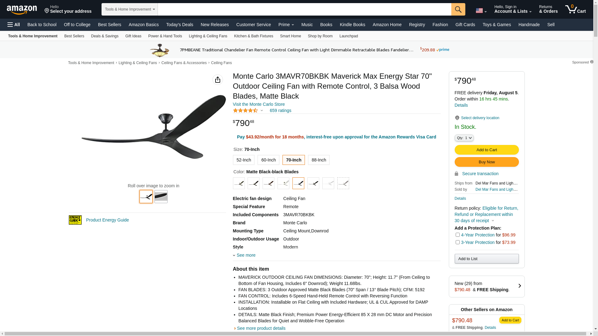 - FAN BLADES: 3 Outdoor Approved Matte Black Blades (70" Span / 13° Blade Pitch); CFM: 5192