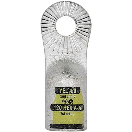 'One-Hole Lug Compression Connector, Gauge 4/0, Stud Size 3/8 In., Connection Material Copper, Connection Type Crimp, Color Yellow, Standards UL Listed, cUL Listed, Includes Fasteners'