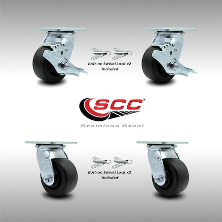 Stainless Steel Polyolefin Swivel Top Plate Caster Set 4 w/4" x 2" Black Wheels-Includes 2 Swvl w/Brakes and Bolt on Swivel Locks&2 Swivel w/Bolt on Swivel Lcks-2000lbs Total Cpty-Service Caster Brand
