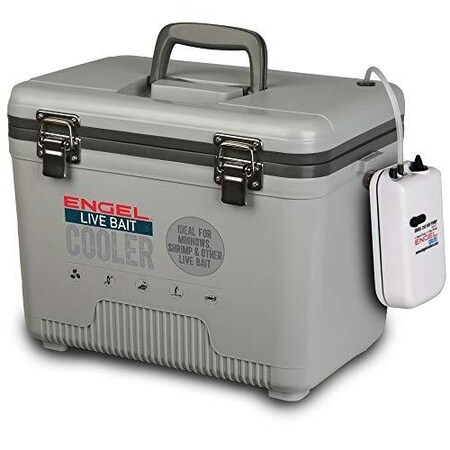 - ENGEL HARD SHELL LIVE BAIT FISHING COOLER: Stainless Steel industrial strength latches, easy-pull net, 2nd generation battery operated aerator pump and hinged lid for quick and access to your live bait, minnows and shrimp. EVERY COLOR & SIZE TO MATCH YOUR ADVENTURE: 3 color options with UV inhibitors protect the cooler’s against sun damage and extends the life of the dry box and 4 sizes, including 7.5Qt, 13Qt, 19Qt and 30Qt. This makes it the best replacement for your old minnow buckets.