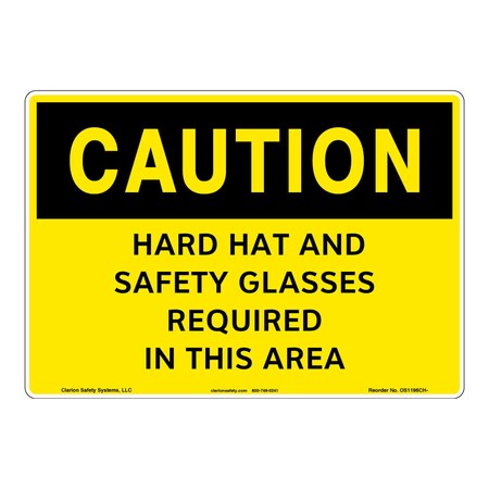 <p><strong>Word Message: </strong><br />HARD HAT AND SAFETY GLASSES REQUIRED IN THIS AREA</p><p><strong>Description: </strong><br />Clarion Safety Systems brings you Caution Hard Hat and Safety Glasses Required in This Area safety signs (OS1196CH-) which are produced on premium plastic or aluminum material and are designed to meet your OSHA safety sign needs.<p><strong>Material Information:</strong></p> <ul> <li><strong>Material</strong>: (BJ) Indoor/Outdoor Plastic</li> <li><strong>Base Materials</strong>: .060" Rigid White Plastic</li> <li><strong>Overlaminate</strong>: none</li> <li><strong>Mounting Option</strong>: Mounting holes</li> <li><strong>Application</strong>: Indoor/Outdoor</li> <li><strong>MaxTemp</strong> (F): 140</li> <li><strong>MinTemp</strong> (F): 32</li> <li><strong>Chemical Resistance</strong>: Good</li> <li><strong>UV Resistance</strong>: Good</li> <li><strong>Outdoor durability</strong>: Good</li> <li><strong>Storage Stability</strong>: Stable. Optimum storage conditions: 72 F @ 50% relative humidity</li> <li><strong>Expected Life Indoor</strong>: Long term</li> <li><strong>Expected Life Outdoor</strong>: 3-5 year (expected outdoor life may vary due to climatic conditions)</li> <li><strong>RoHS</strong>: Yes</li> <li><strong>CRoHS</strong>: Yes</li> <li><strong>REACH</strong>: Yes</li> </ul>