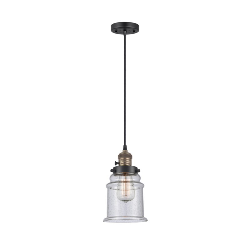 INNOVATIONS 201CSW-BAB-G184-LED 1-Light Mini Pendant Black Antique Brass. Collection: Franklin Restoration. Style: Industrial, Farmhouse, Seaside, Nautical, Restoration-Vintage, Traditional. Metal Finish: Black Antique Brass. Metal Finish (Canopy/Backplate): Black Antique Brass. Material: Steel, Cast Brass, Glass. Dimension(in): 10(H) x 6(W) x 6(Dia). Min/Max Height (Fixture Height with Cord or Included Stems & Canopy)(in): 14.5/132.5. Wire/Cord: 10 Feet Of Black Textured Cord. Bulb: (1)6W Medium Base,Dimmable(Not Included). Maximum Wattage Per Socket: 100. Voltage: 120. Color Temperature (Kelvin): 2700. CRI: 82. Lumens: 600. Glass Shade Description: Seedy Canton. Glass or Metal Shade Color: Seedy. Shade Material: Glass. Glass Type: Seeded. Shade Shape: Bell. Shade Dimension(in): 6(W) x 7.25(H). Fitter Measurement (Glass Or Metal Shade Fitter Size): 3.25 inch Fitter. Canopy Dimension(in): 4.5(Dia) x 0.75(H). Sloped Ceiling Compatible: Yes. California Proposition 65 Warning Required: Yes. UL & ETL Certification: Damp Location.