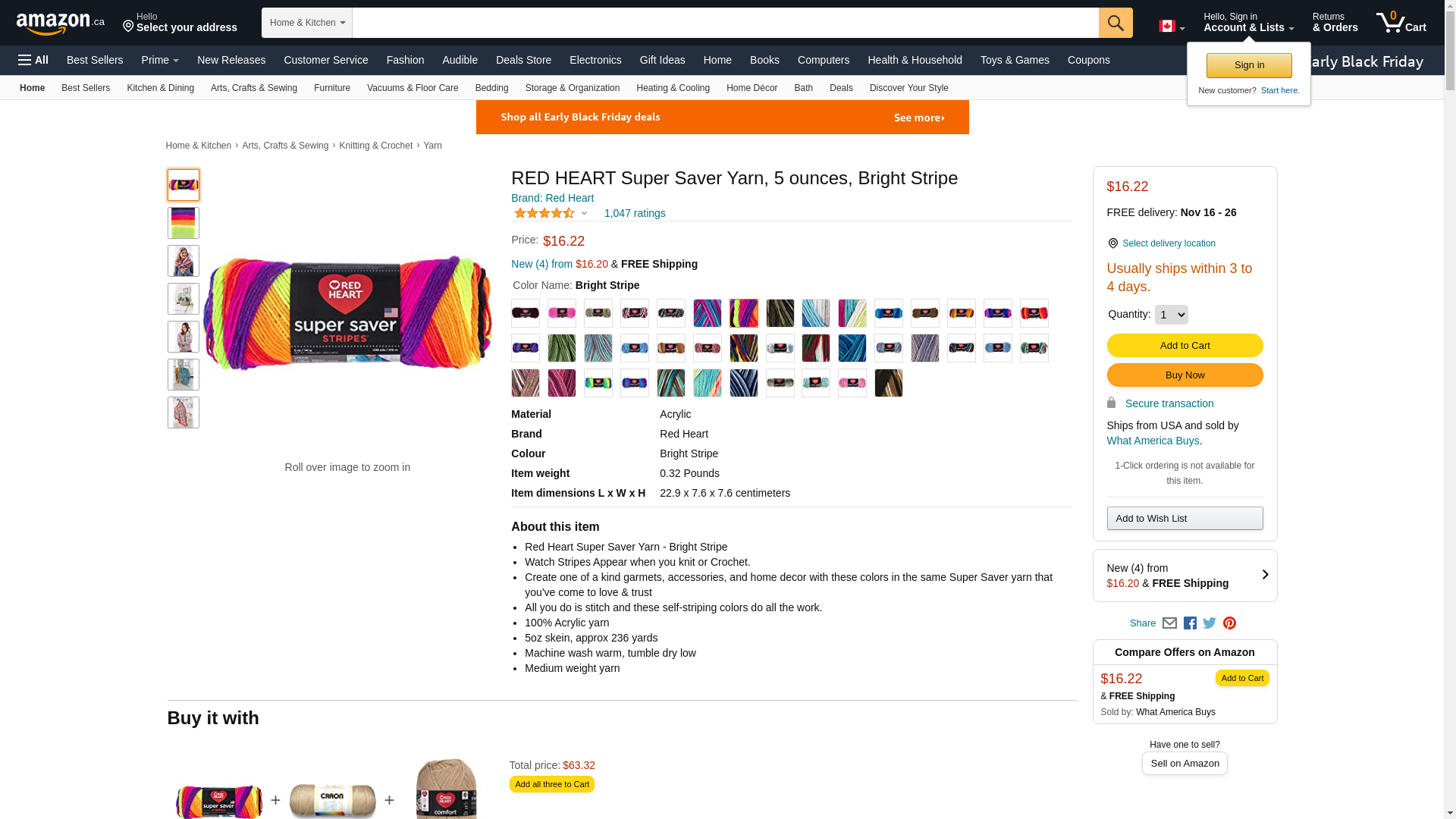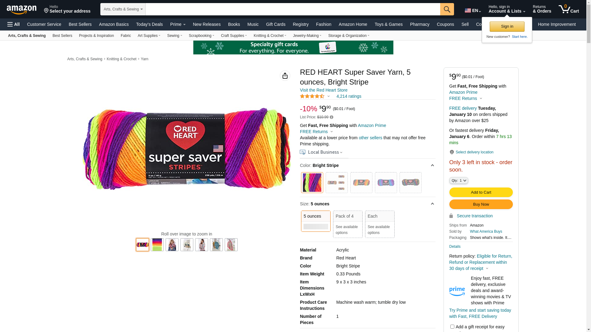 Red Heart-Super Saver Yarn. This medium weight has been America's bestselling yarn for over seventy years! Perfect for all knit and crochet projects. Weight category: 4. Content Solids & Multi: 100% acrylic. Content Flecks: 96%acrylic/4% other fibers. Putup Multi & Flecks: 5oz/141g, 236yd/215m. Putup Solids: 7oz/198g, 364yd/333m. Gauge: 17st x 23r = 4in/10cm on size US8/5mm knitting needles, Suggested crochet hook size I9/5.5mm hook. Dyelotted: We try but are not always able to match dyelots. Solids are not Dyelotted. Care: machine wash, tumble dry, do not bleach, do not iron, dry cleanable. Made in USA. Color: Multi