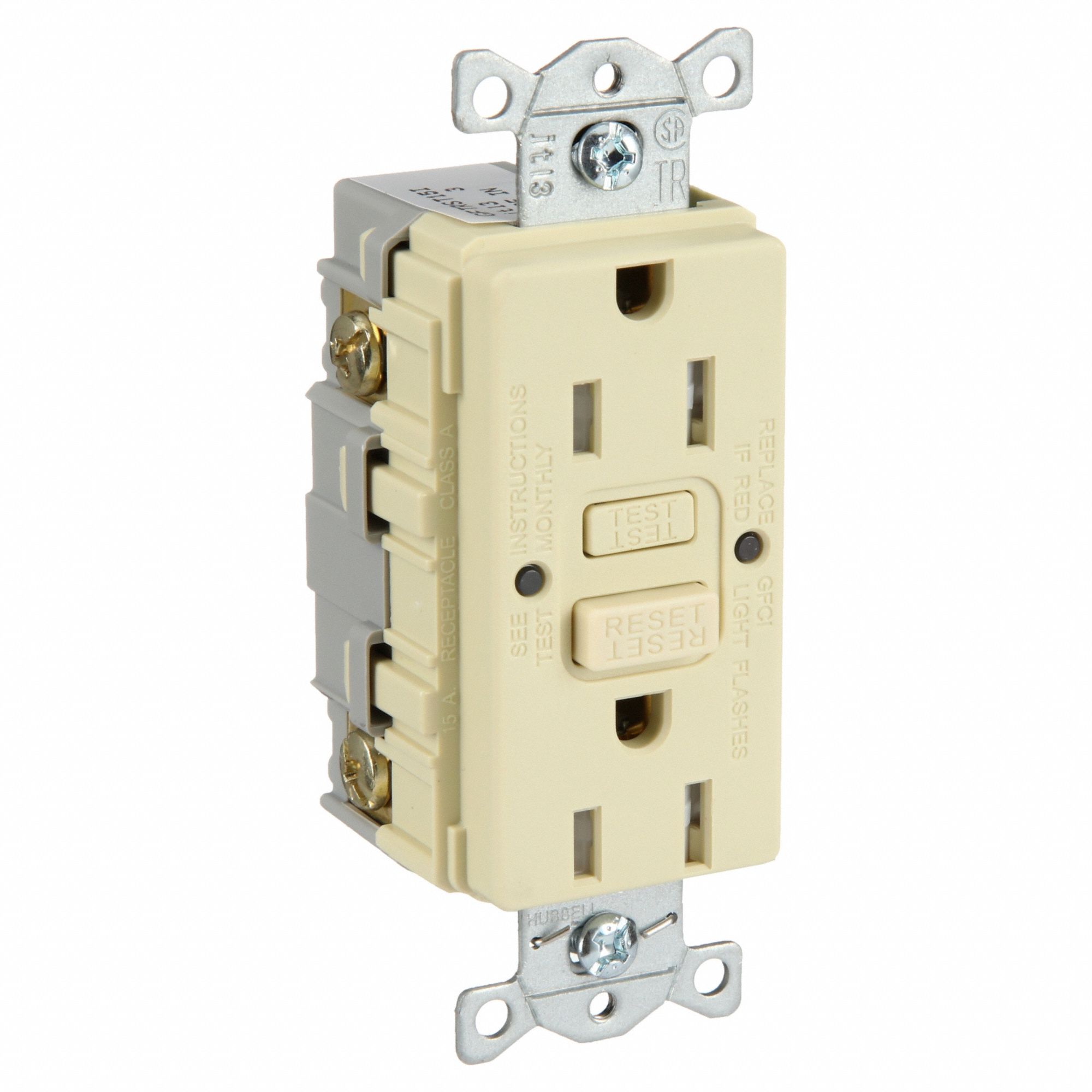 - <b>Price For:</b> Each <b>Weather Resistant</b>: No <b>Standards</b>: UL listed, CSA certified <b>Voltage</b>: 125VAC <b>Mounting Type</b>: Flush <b>HP</b>: 0.5 <b>Amps</b>: 15A <b>Tamper Resistant</b>: Yes <b>Application Environment</b>: Commercial Environments <b>Power Indicator</b>: Yes <b>Surge Suppression</b>: No <b>Color</b>: Ivory <b>Number of Wires</b>: 3 <b>Reset Type</b>: Manual <b>Number of Poles</b>: 2 <b>NEMA Configuration</b>: 5-15R
