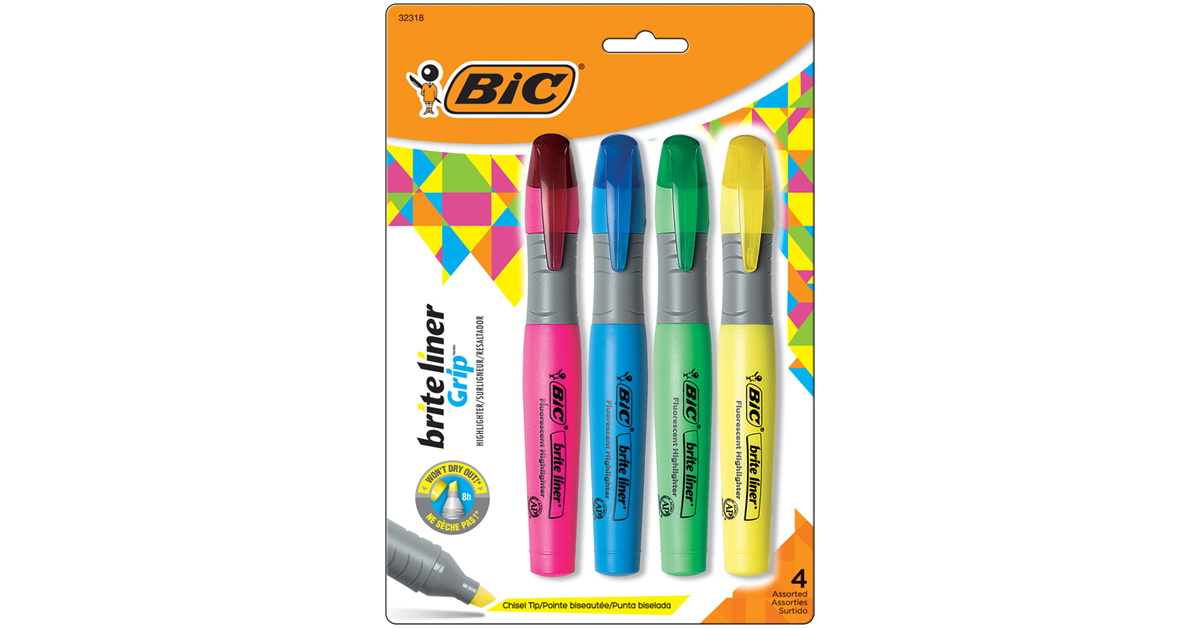 Brite Liner Grip Tank Highlighter, Chisel Tip, Assorted Colors, Pack of 4 - BICBLMGP41ASST | Bic Usa Inc | Highlighters