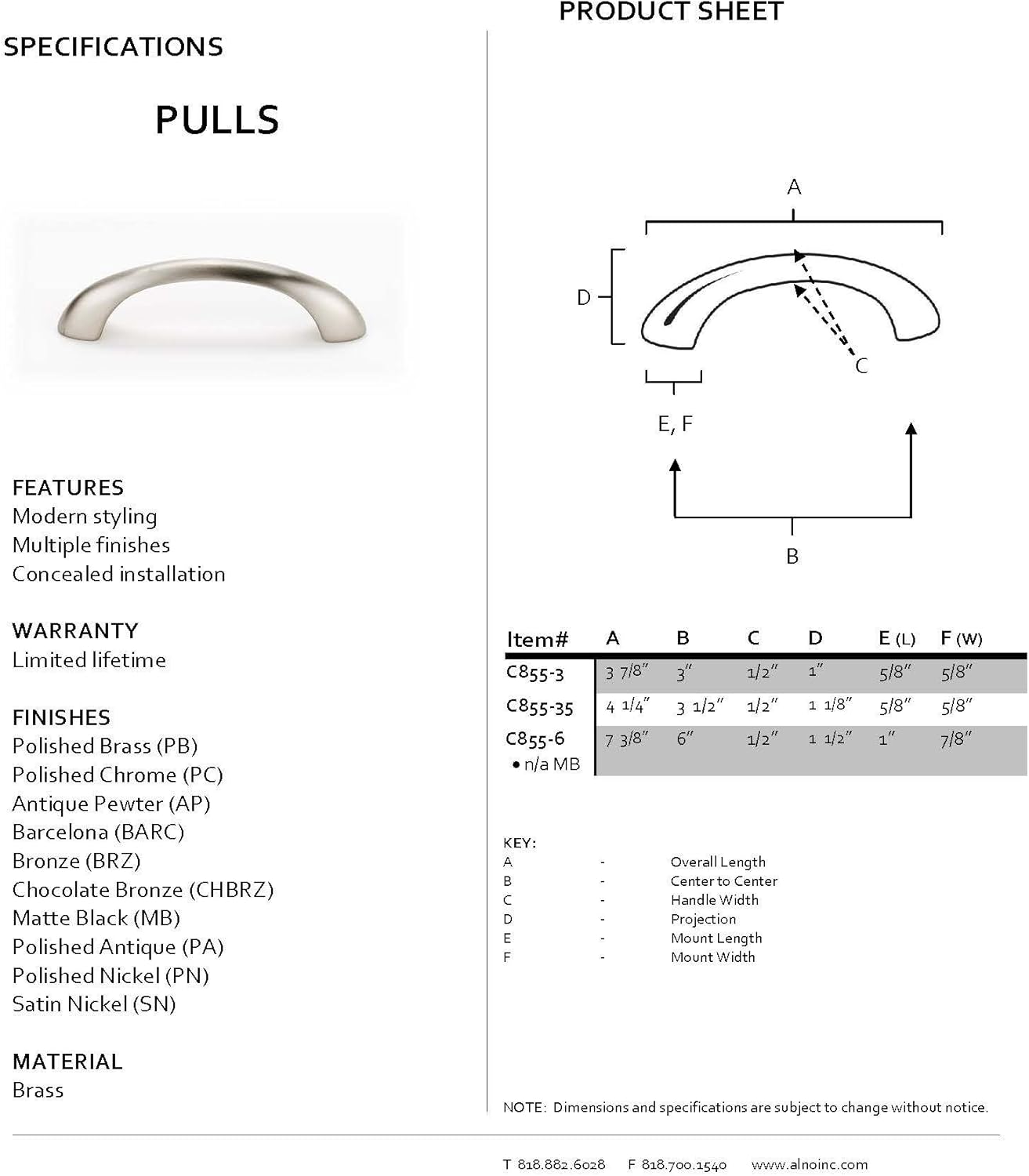 C855-3-PN Finish: Polished Nickel Features: -Brass construction. -Transitional collection. -Arch pull demilune. -5 Year warranty. Style: -Modern. Primary Material: -Metal. Fasteners Included: -Yes. Pull Type: -Arch pull. Dimensions: Overall Height - Top to Bottom: -0.5". Overall Width - Side to Side: -3". Overall Depth - Front to Back: -0.63". Overall Product Weight: -0.2 lbs.