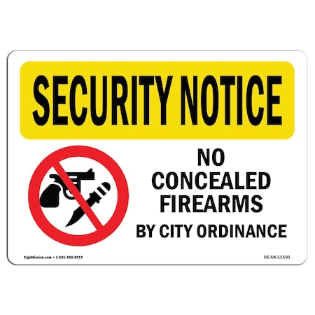 OSHA SECURITY NOTICE Sign, No Concealed Weapons By City, 24in X 18in Rigid Plastic