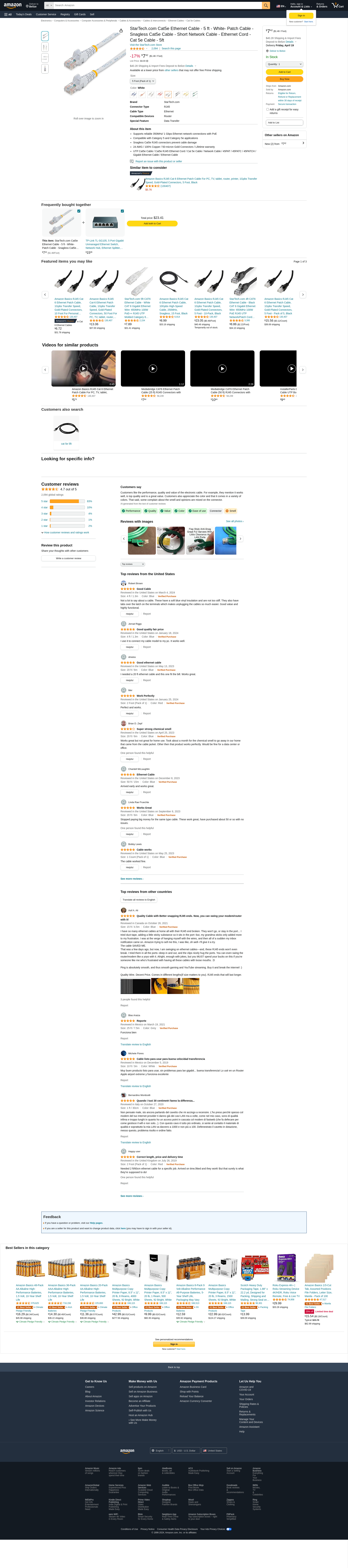 StarTech.'s Cat5e UTP Snagless Patch Cables offer reliable Ether connections. This 5-foot cable meets or exceeds all Category 5e specifications and features a durable white jacket that simplifies departmental color coding while providing rugged flexibility for work connectionsPrimary InformationNetwork Cable Type : Network Cable Cable Technology : Unshielded twisted pair (UTP) Left Connector Gender : Male Right Connector Gender : Male Left Connector Type : RJ-45 Right Connector Type : RJ-45 Dimensions&MiscellaneousLength : 5 feet Enclosure Color : White Special FeatureRoHS : Y UNSPSC CodeUNSPSC Code : 26121609
