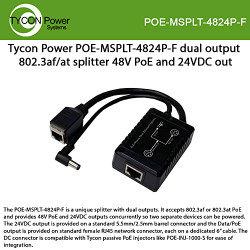 The POE-MSPLT-4824P-F is a unique splitter with dual outputs. It accepts 802.3af or 802.3at PoE and provides 48V PoE and 24VDC outputs concurrently so two separate devices can be powered. The 24VDC output is provided on a standard 5.5mm/2.5mm barrel connector and the Data/PoE output is provided on standard female RJ45 network connector, each on a dedicated 6” cable. The DC connector is compatible with Tycon passive PoE injectors like POE-INJ-1000-S for ease of integration. In addition to being compatible with 10/100MB Ethernet speeds, inputs and outputs are isolated and the devices include protections for short circuit and overload.