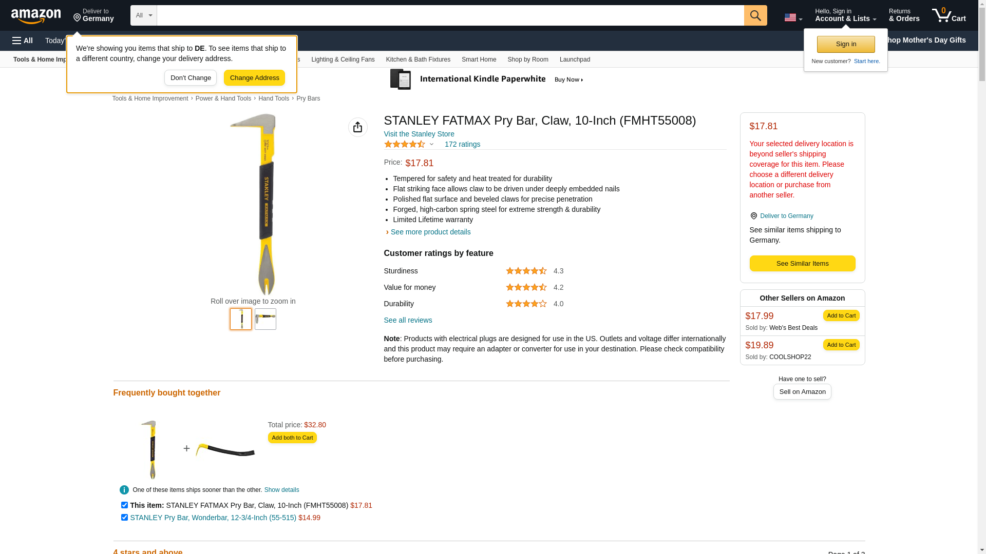 Stanley FMHT55008 FatMax Claw Bar, 10", Case of 2 Case of 2 claw bars Tempered for safety and heat treated for durability Flat striking face allows claw to be driven under deeply embedded nails Polished flat surface and beveled claws for precise penetration Forged, high-carbon spring steel for extreme strength & durability