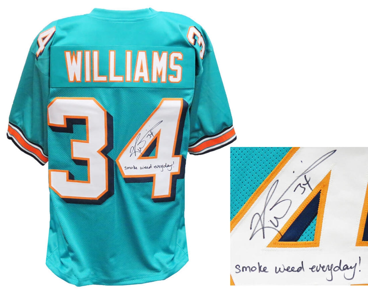 Schwartz Sports Memorabilia WILJRY322 NFL Miami Dolphins Ricky Williams Signed Teal Custom Football Jersey with Smoke We