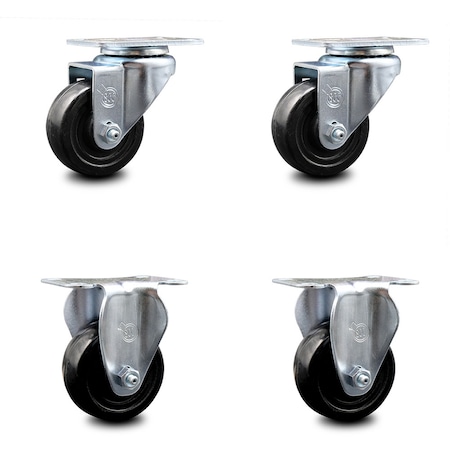 Hard Rubber Swivel Top Plate Caster Set of 4 with 3 Inch Black Wheels - Includes 2 Swivel and 2 Rigid - 1100 lbs. Total Capacity - Service Caster Brand
