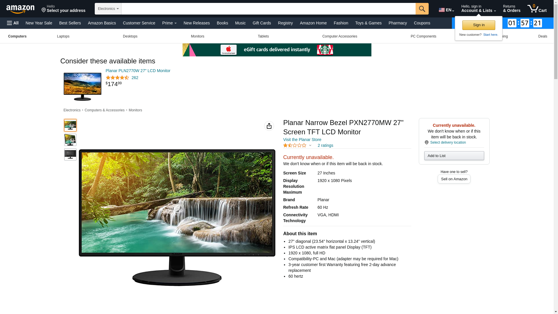 Planar Narrow Bezel PXN2770MW 27" Screen TFT LCD Monitor
