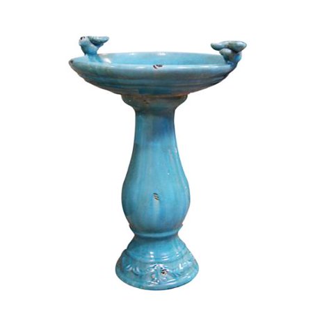 Perfect for out in your garden or near your favorite gathering spot, this antique ceramic bird bath in charming hues of turquoise brings timeless beauty to your outdoor decor. A shallow basin allows easy access for all bird types while two bird accents lends an inviting design for your feathered friends. <br /> <br /> <ul> <li>Dimensions: 18 inches long x 16 inches wide x 25 inches high</li> <li>Materials: Ceramic</li> <li>Finish: Bold tones of turquoise</li> <li>Quantity: One (1)</li> </ul> <br /> <i>The digital images we display have the most accurate color possible. However, due to differences in computer monitors, we cannot be responsible for variations in color between the actual product and your screen.</i> <br />