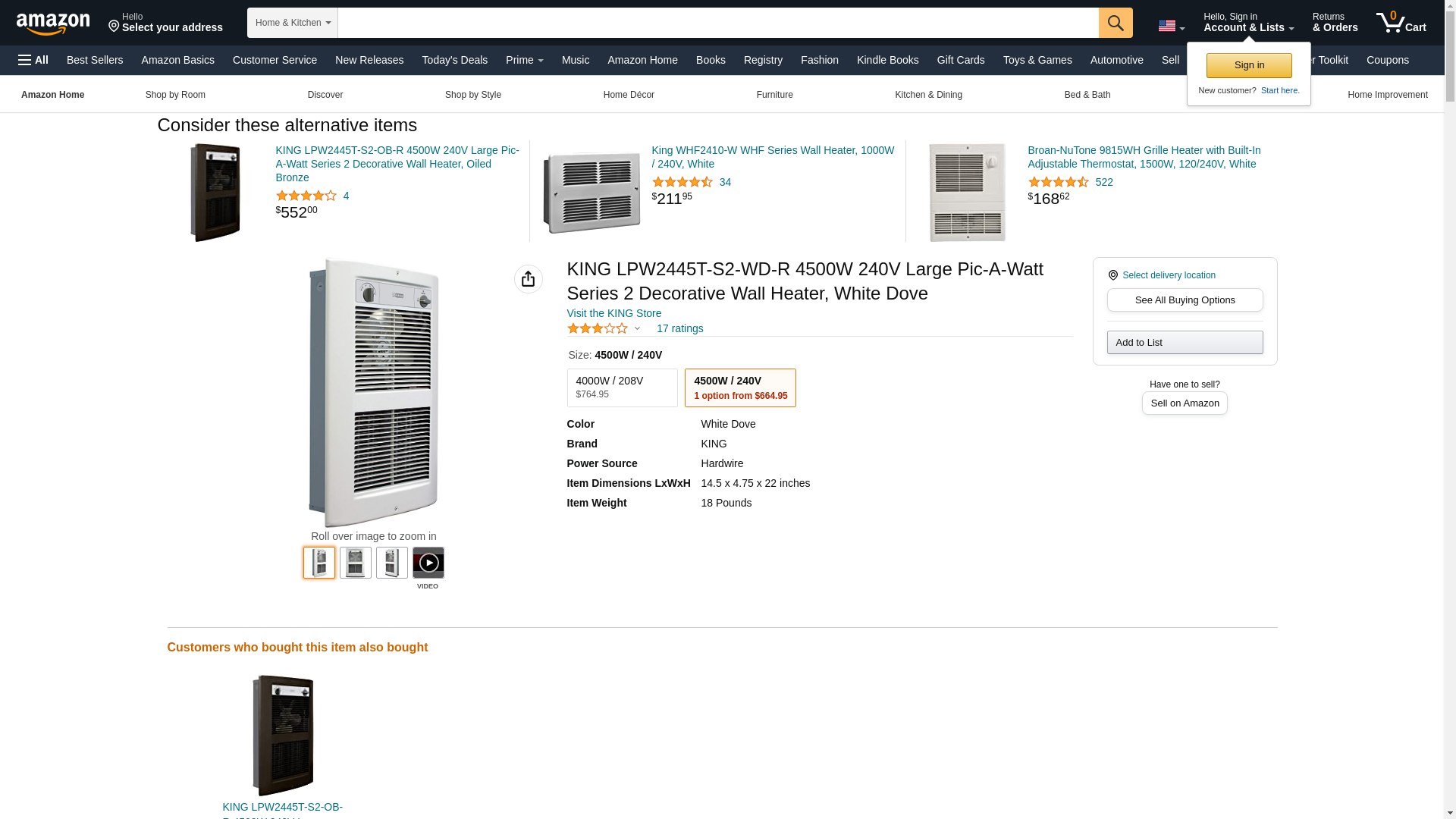 King Electric LPW Series 2 Forced Air Wall Heater LPW2445T-S2-WD-R White 240V 4500W King redefines comfort with a sleek and modern new architectural design. Offering higher output than our industry leading PAW heater. King's exclusive dual Pic-A-Watt steel fin elements allow customers to select from a range of wattage options, tailoring the heater to an area's specific heating requirements. With up to 4500W, this is our most popular large wall heater, used in both residential and commercial applications. Standard with a 3-position Heat/Fan/Off Switch and a fan delay to help dissipate heat from the high-mass steel plate fin elements thereby prolonging heater life and increasing energy efficiency. Motor Type: Heavy-duty, cast iron, unit bearing, permanently lubricated with 20cc oil reservoir, 1440 RPM. Enclosed impedance protected with intake air cooling motor for increased bearing life. Patented Smart Limit Protection: Disconnects Elements And Motor In The Event Normal Operating Temperatures Are Exceeded. The high quality built-in thermostat has degrees on the label so temperature selection is easy and accurate. Now Available in 4 design colors to match any decor: White Dove, Oiled Bronze, Satin Nickel and Almondine. ARCHITECTURAL TYPE; 20 GAUGE ELECTRO-GALVANIZED STEEL MATERIAL; WHITE DOVE COLOR; UL (CANADA AND US) APPROVAL; RESIDENTIAL, COMMERCIAL APPLICATION; 240/208 VOLT VOLTAGE RATING; WALL MOUNTING; 9.4 TO 18.8 AMP CURRENT RATING; 2250/2750/3000/3250/3500/3750/4000/4500 WATT POWER RATING; 185 CFM AIR FLOW RATE; BUILT-IN 1-POLE 45 TO 80 DEG F THERMOSTAT, 3-POSITION SWITCH CONTROL TYPE; FURNACE-BRAZED PLATE-FINNED (3) STEEL SHEATHED HEATING TUBE HEATING ELEMENT; 9-4/9 INCH WIDTH X 3-13/16 INCH DEPTH X 20-9/16 INCH HEIGHT (HOUSING), 14-9/16 INCH WIDTH X 1-1/2 INCH DEPTH X 21-13/16 INCH HEIGHT (GRILL) HOUSING SIZE; 1440 RPM HEAVY DUTY CAST IRON UNIT BEARING PERMANENTLY LUBRICATED FAN/MOTOR TYPE; GRILLE MATERIAL POWDER COATED PAINT GLOSS WHITE 20 GAUGE STEEL; LPW,
