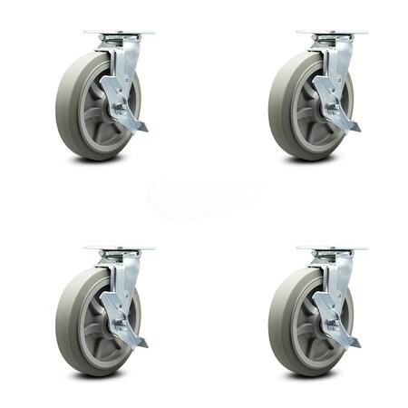 Thermoplastic Rubber Flat Tread Swivel Top Plate Caster Set of 4 w/8" x 2" Gray Wheels - Includes 4 Swivel w/Top Lock Brakes - 2400 lbs Total Capacity - Service Caster Brand