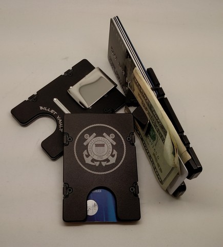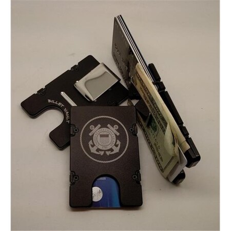 The Billet Aluminum Front Pocket Wallet Credit Card Holder with RFID Protection has been minimally machined from two pieces of solid 6061 T6 aircraft grade aluminum Carry only what you need with its size easily adjustable to up to twelve cards for traveling or networking events Comes with a removable money clip money organizer pusher card for your currency and four extra Orings This wallet credit card holder is anodized then laser engraved The lightweight construction of this wallet lends itself to utter comfort The slim front pocket profile helps alleviate lower back pain while the tough construction keeps your information secure by blocking RFID Devices used to wirelessly steal your identity or credit card information Features. U S Coast Guard RFID Protected Aluminum Wallet Credit Card Holder. Wallet will never wear outSpecifications. Color Black. Material Aluminum. Dimension 2 38 x 3 12 x 14