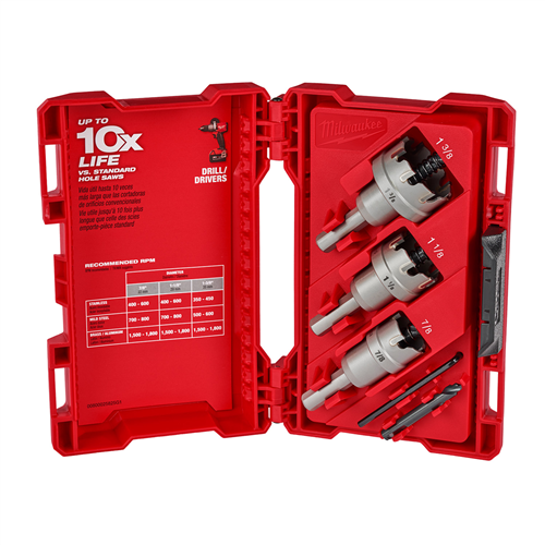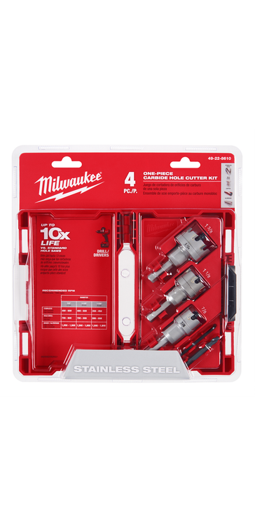 Milwaukee ONE-PIECE CARBIDE CUTTERS feature Carbide Teeth for Longer Life and Smooth cuts in stainless steel and other hard metals. Each cutter features a Stop Shoulder Design which prevents over-drilling, limiting cuts to a 3/16 in. depth, while a 3-Flat Shank optimizes each cutter for use in Drill/Drivers. To ensure clean, efficient cutting, the Spring Loaded Pilot Bit provides complete plug ejection upon completion of each hole. The solid one-piece design of each cutter provides added durability and dependability cut after cut. Milwaukee One Piece carbide Cutters are available in sizes ranging from 3/4 in. - 4-1/2 in. One-Piece Design For Added Durability For Use With Drill/Drivers Includes: 7/8 in., 1-1/8 in., 1-3/8 in. Cutters, Hex Key, and Additional Pilot Bit For Use In Stainless Steel, Mild Steel, Copper, Aluminum, and Other Metal Materials Includes: 7/8 in. One-Piece Carbide Hole Cutter - 49-57-8609,1-1/8 in. One-Piece Carbide Hole Cutter - 49-57-8615,1-3/8 in. One-Piece Carbide Hole Cutter - 49-57-8623,Carbide Hole Cutter Pilot Bit - 49-57-8660,Hex Key,Case.