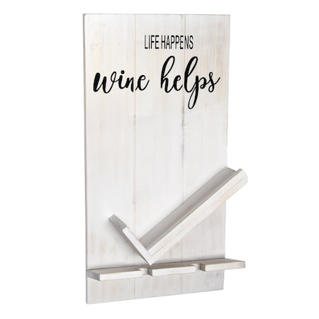 Elegant Designs Lucca Wall Mounted Wooden Life Happens Wine Helps Wine Bottle Shelf with Glass Holder, White Wash