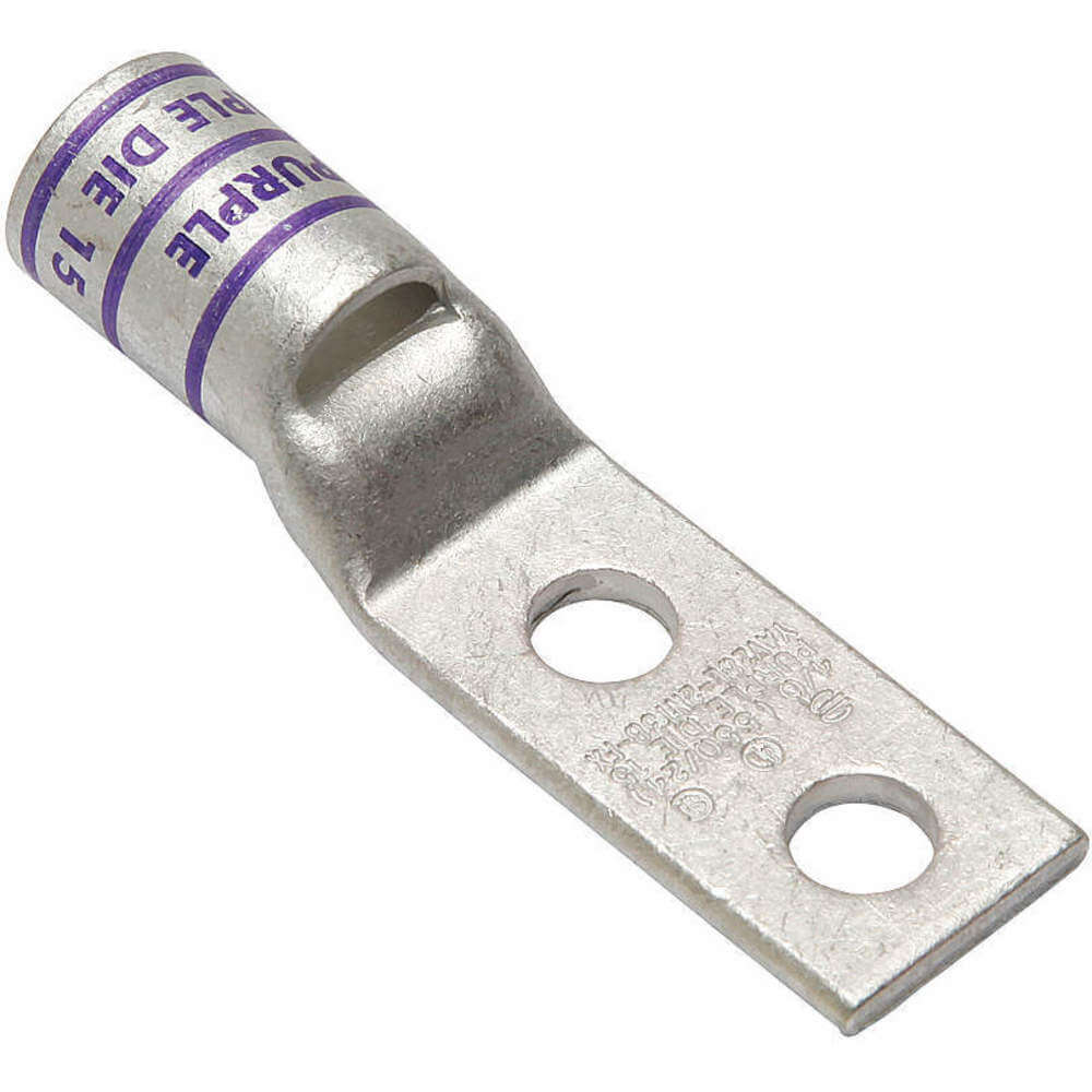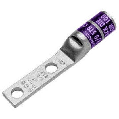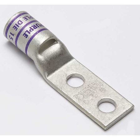 - <b>Price For:</b> Each <b>Standards</b>: UL listed, CSA certified <b>Connector Type</b>: Straight Barrel <b>Plate Material</b>: Electro Tin <b>Material</b>: Copper <b>Peep Hole</b>: Yes <b>Color Code</b>: Purple <b>Width</b>: 0.94" <b>Length</b>: 3.43" <b>Lug Compression Connector Type</b>: Two-Hole Lug Compression Connector <b>Item</b>: Two-Hole Lug Compression Connector <b>Tongue Style</b>: Narrow <b>Hole Center to End</b>: 0.410"