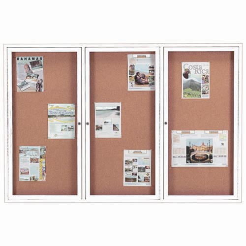 Enclosed Aluminum Frame Bulletin Board with a White Powder Coated Finish are made of custom extruded parts engineered to provide accurate, durable and handsome Cabinet. All corners are neatly mitered and assembled with heavy duty reinforcements and fasteners. Lockable doors are mounted with a full length piano hinge and feature acrylic safety glass windows. The background is an attractive Natural Pebble Grain Cork tackable panel. Concealed mounting brackets are provided. Unit is Illuminated with UL listed fluorescent fixtures feature a light diffuser. A 3 wire electrical lead is provided. This is a 3-Door unit. Frame Color: White. Frame construction: Aluminum. Interior color: Natural Cork. Type: Without Header. Surface material: Natural pebble grain cork. Exterior depth: 4". Size: 48" H x 72" W.