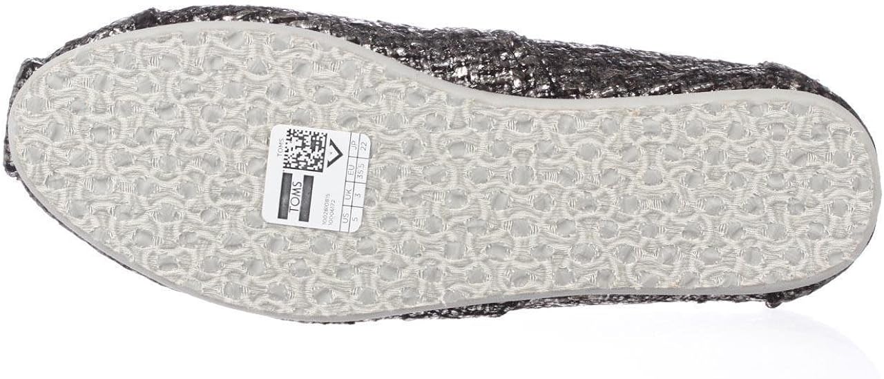 TOMS Womens Classic Shoes in Silver Glitter Wool. Add some glimmer to your wardrobe. This classic shoe. features all the iconic TOMS details like an elastic V-gore for easy styling, decorative toe-stitch, cushioned suede insole, and flexible outsole. Pair with dark skinnies or thick leggings while running errands around town. With every pair of shoes you purchase, TOMS will give a new pair of shoes to a child in need.