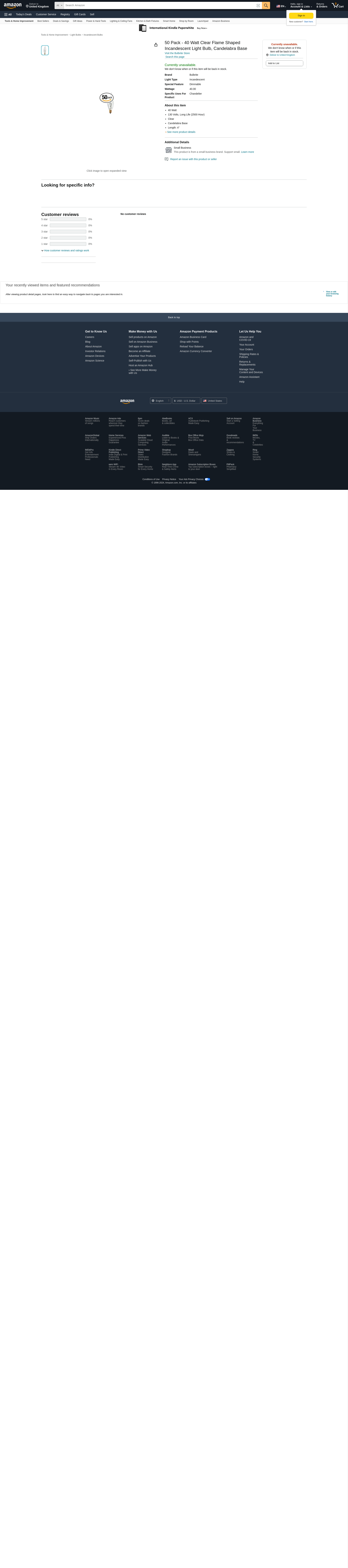 50 Pack -- 40 Watt Clear Flame Shaped Incandescent Light Bulb, Candelabra Base