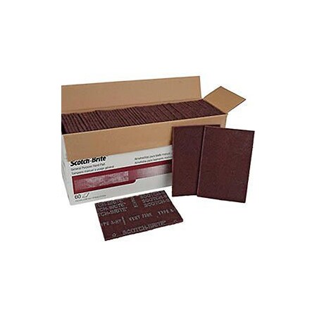 Open, aggressive web that is excellent to grain, clean, denib, defuzz and finish. Resistant to loading. May be used by hand, on a hand pad block, or on an in-line sander. 3M Abrasive Hand Pad Type: Scotch-Brite general purpose hand pad Model: 7447 Grit: Very Fine Color: Maroon Size: 6" x 9" Packaging Qty: 20 pads per b