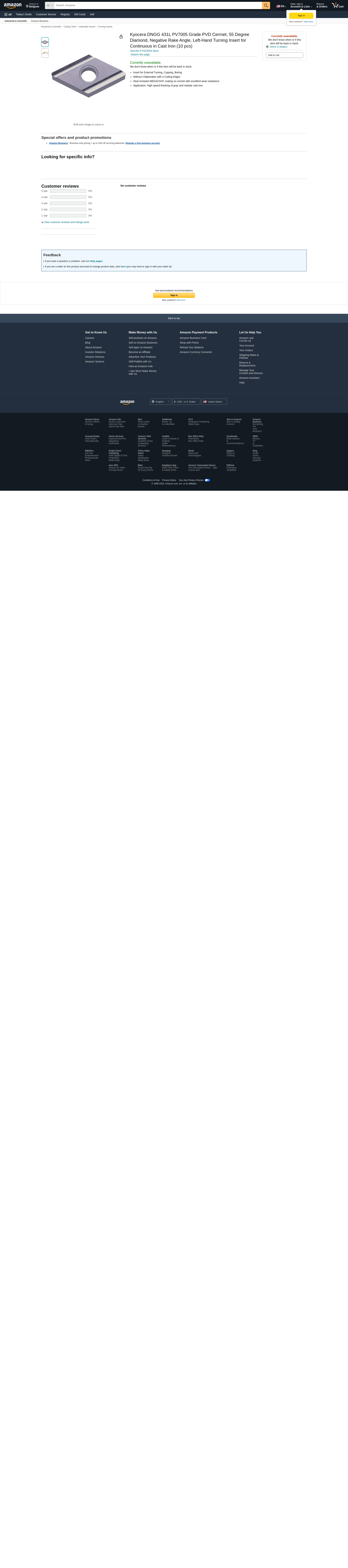 Kyocera DNGG 431L PV7005 Grade PVD Cermet, 55 Degree Diamond, Negative Rake Angle, Left-Hand Turning Insert for Continuous in Cast Iron (10 pcs)