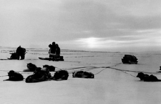 - Arctic people standing near sledge dogs on leashes lying down