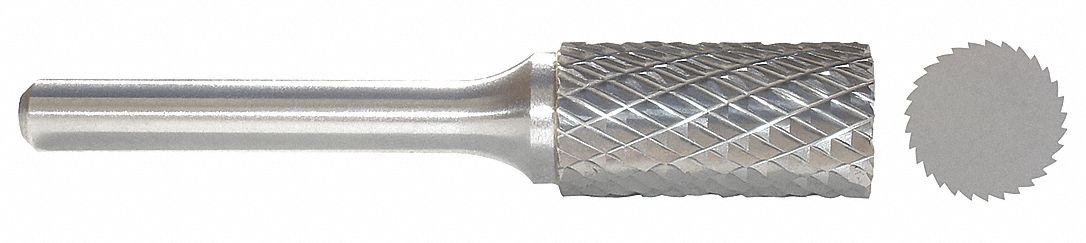 'Carbide Bur, Shape Cylinder, Cutter Dia. 3/32 In., Shank Size 1/8 In., Overall Length 1-1/2 In., Length of Cut 7/16 In., Cutting Edge Type Double Cut, Shank Material Steel, Trade Number SA-42, Application Deburring'