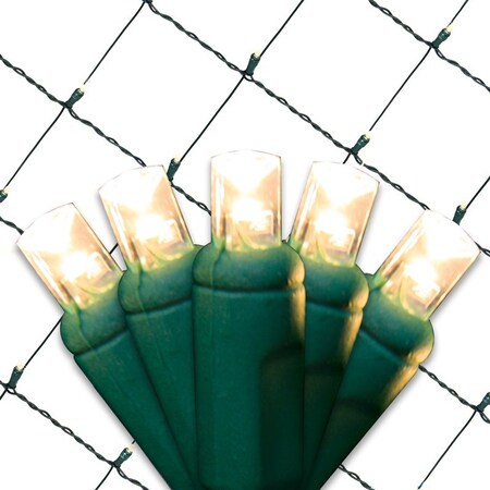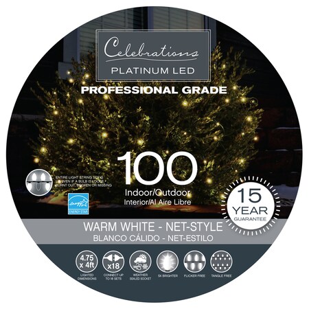 Highlights: Lumens: 8 Wire Color: Green Bulb Color: Warm White Lighted Length: 4-3/4' x 4' Bulb Type: LED Style: Net Number of Lights: 100 lights Indoor or Outdoor: Indoor and Outdoor Power Source: Plug In Weather Resistant: Yes Warning: This product can expose you to chemicals including (lead) which is known to the St
